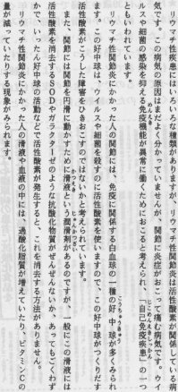 リウマチ性関節炎にかかった人の関節には、免疫に関係する白血球の一種の好中球が多くみられます。この好中球は、ウイルスや細菌を殺すのに活性酸素を使いますので、この好中球がつくりだす活性酸素が、こうした障害をひきおこすのではないか、と考えられています。 |